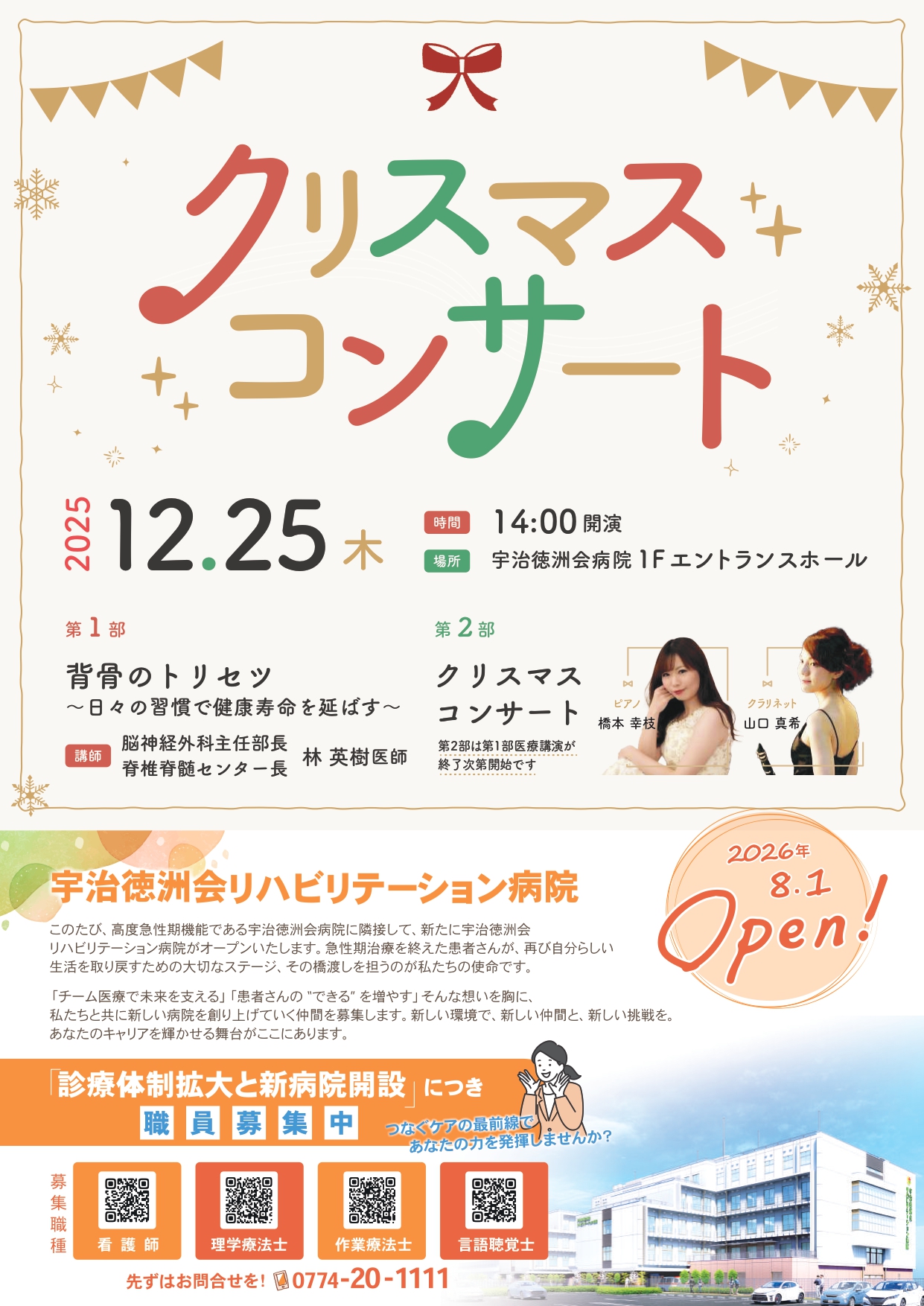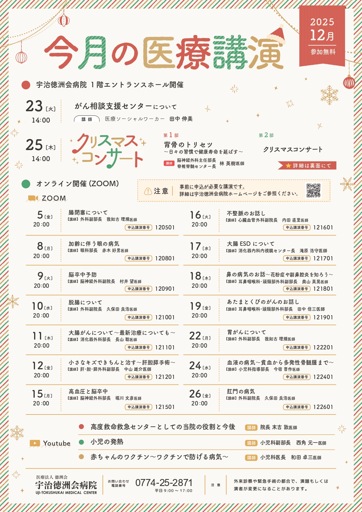 | 2025年12月25日(木) | 14:00~ | 背骨のトリセツ-日々の習慣で健康寿命を延ばす- | 脳神経外科 主任部長/林 英樹 医師 | 宇治徳洲会病院 1階エントランスホール |