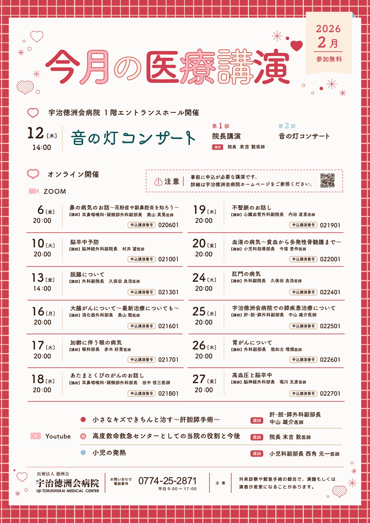 | 2026年2月12日(木) | 14:00~ | 院長講演 | 院長/末吉 敦 医師 | 宇治徳洲会病院 1階エントランスホール |
