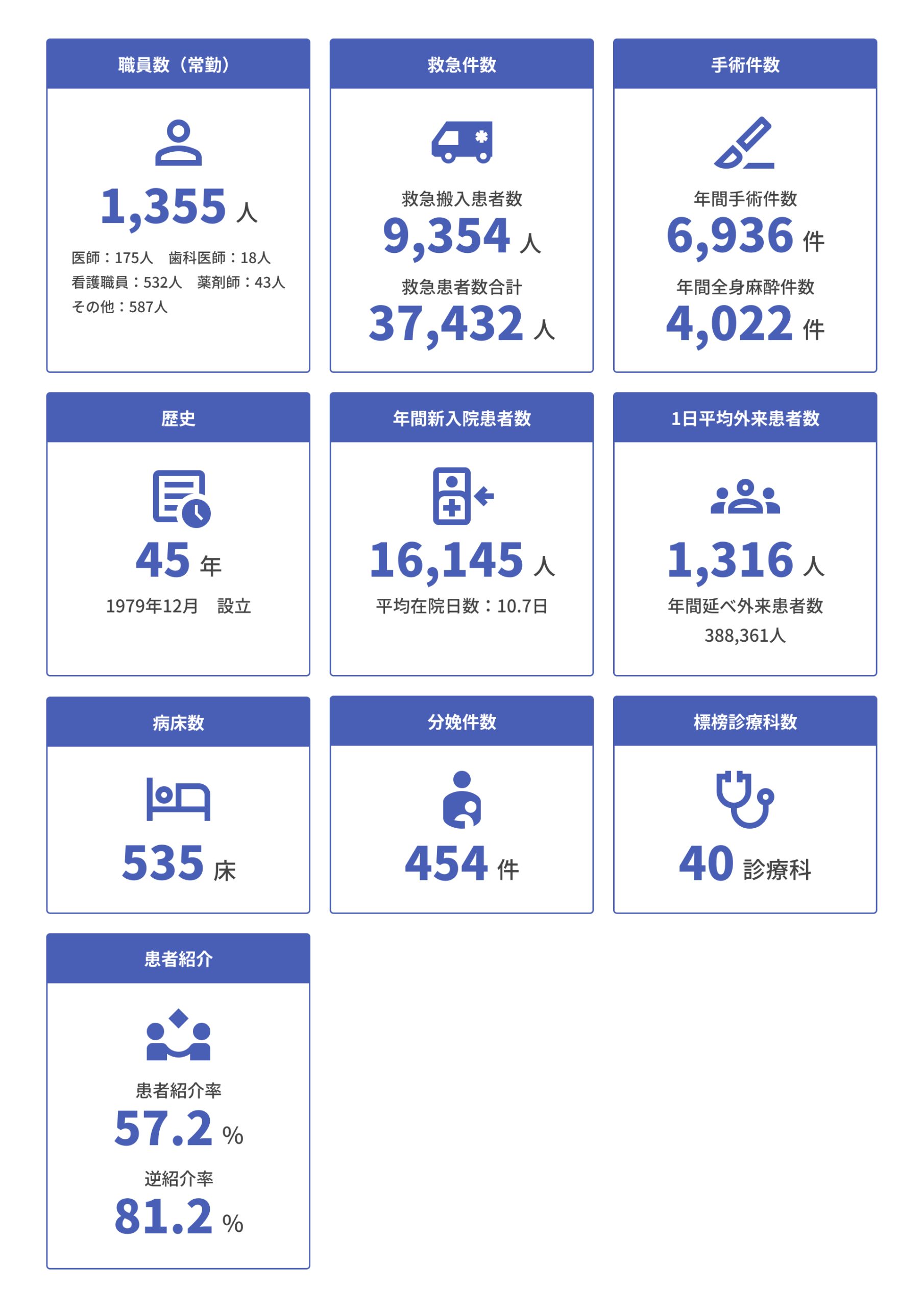 | 診療科目 | 内科、呼吸器内科、消化器内科、肝臓内科、リウマチ内科、腎臓内科、腫瘍内科、糖尿病・内分泌内科、脳神経内科、心臓血管内科、人工透析内科、血液内科、小児科、外科、消化器外科、肝・胆・膵外科、こう門外科、呼吸器外科、小児外科、乳腺外科、整形外科、形成外科、脳神経外科、心臓血管外科、泌尿器科、耳鼻いんこう科、頭頸部外科、皮膚科、眼科、産婦人科、放射線診断科、放射線治療科、ペインクリニック・疼痛緩和外科、緩和ケア内科、麻酔科(鬼頭秀樹)、歯科口腔外科、リハビリテーション科、救急科(救急総合診療科)、病理診断科、精神科 |