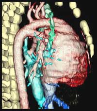 診断や病状の把握のためには、問診・診察のほか、胸部X線、心電図・心エコー・心臓カテーテル検査・CT検査・MRI検査・血液検査、などを行います。その中でも特に診断精度が高いのが超音波検査法で、先天性心疾患を胎児の段階から診断することができるようになっています。また、CTやMRIを用いた評価では、心血管を三次元表示で観察することができるほか、我々はCT画像上で、独自に開発した動脈・静脈を色分けして描出する動静脈分離イメージングにより複雑な形態異常を評価しています。