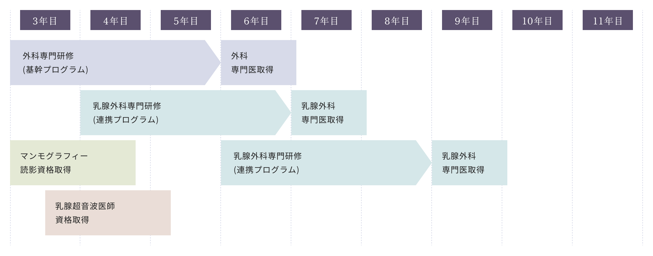- 外来で初診担当医として従事できる、マンモグラフィ読影資格、乳腺超音波検査資格を取得する。