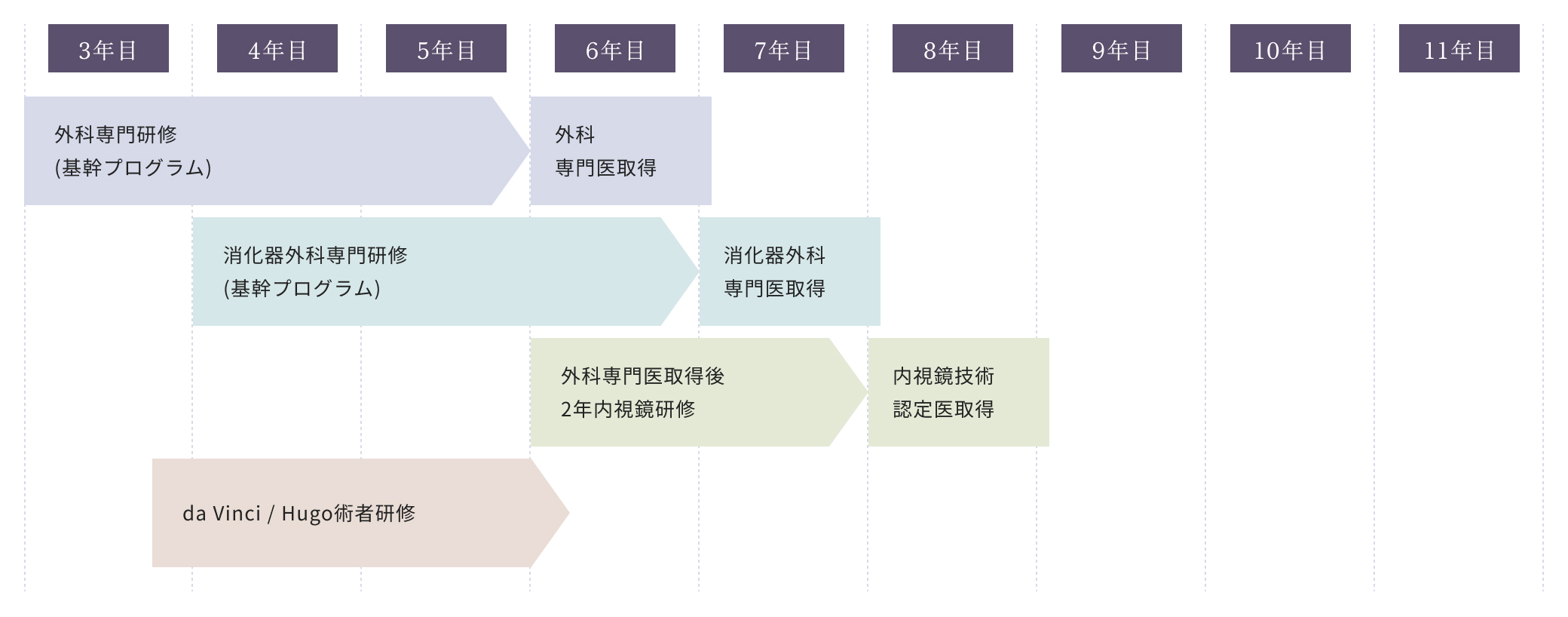 2年目以降は専門の消化器疾患の手術を経験豊富な指導医の元、多く経験頂きロボット手術(DaVinci/Hugo)も専攻医の研修中に経験し3年間を通して手技・臨床能力に留まらず、論文執筆能力などを含めた消化器外科医の育成を行います。